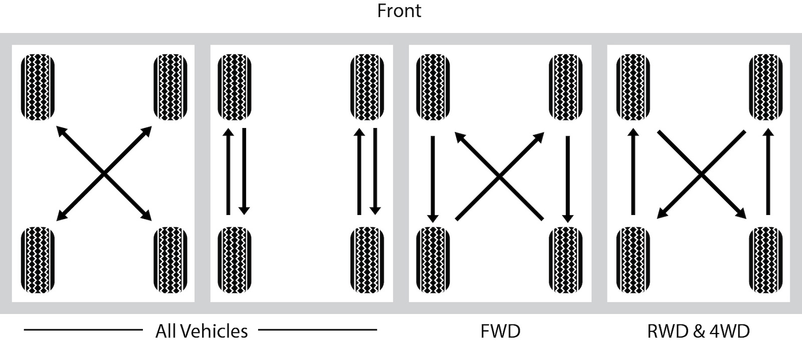For example, front-wheel drive cars with a matching spare can use a forward cross pattern, while rear-wheel or four-wheel drive cars can use a rearward cross pattern.